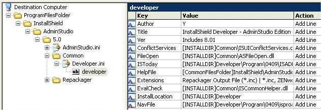 In the INI File tree, select the INI file that you want to edit, and expand the listing so that you can select the appropriate section. That section’s keys, values, and actions are listed: