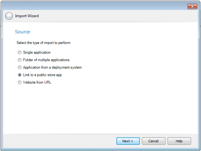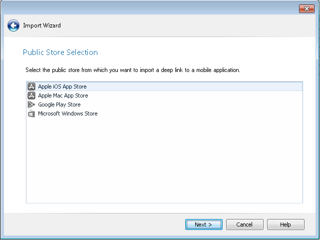 2. Select Link to a public store app and click Next. The Public Store Selection panel opens.