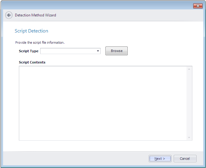 Script TypeFirst, select one of the following options: PowerShell , VBScript , or JScript . Next, click the Browse button and select the script that you want to use for this detection method. You also have the option of entering or pasting the script code directly into the Script Contents box.