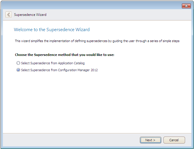 Select Supersedence from Configuration Manager 2012Select to select a supersedent application from Configuration Manager 2012.