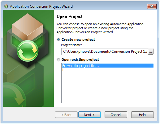 1. Launch Automated Application Converter. The Open Project dialog box opens.