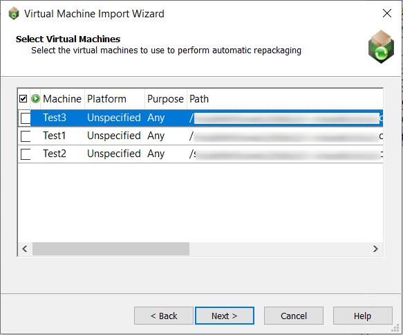 7. On the Select Virtual Machines panel, select the virtual machine images that you want to use to perform automated repackaging.