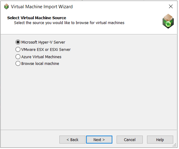 Microsoft Hyper-V ServerOn the Specify Microsoft Hyper-V Server panel, specify Microsoft Hyper-V server name and credentials to browse for virtual machines: Server Name—Enter the server name of the Microsoft Hyper-V Server that you want to connect to. Authentication—Select Windows Authentication if you want to use the credentials of the logged in user to login to the Hyper-V Server. Select Server Authentication if you want to connect to the Hyper-V Server using the specified User name and Password .