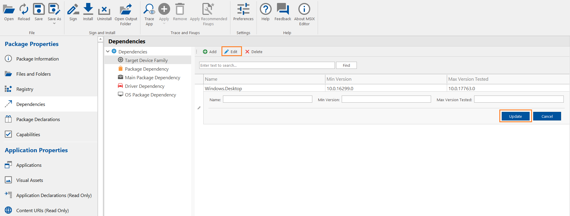 2. To edit, select the desired dependency, and then click the Edit button. The selected dependency is now enabled. Modify the desired fields and then click the Update button to save the changes.