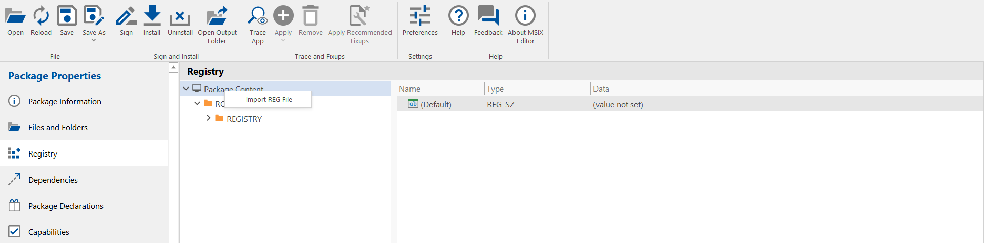 2. In the Registry pane, right-click on Package Content node, and then select Import REG file.