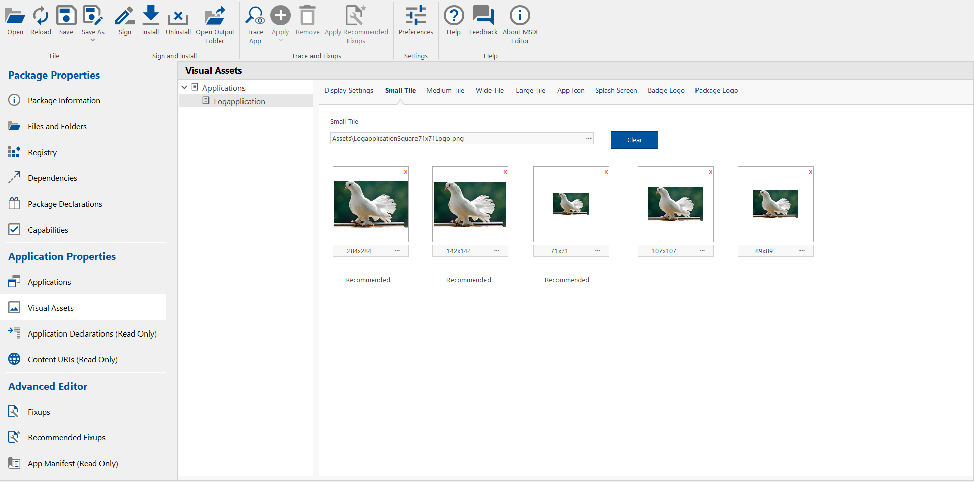 Visual Assets comprise of different tile sizes, application icon, package logo, splash screen and badge logo. Upon its installation, MISX surfaces on a Windows machine through these visual assets, for example as tiles and/or application icon on the start menu. Unlike traditional MSI icons, Visual Assets provide flexibility to specify different sizes of tiles and icons with different images and scales. The Visual Assets view enables you to view, edit and generate new visual assets for an MSIX package.